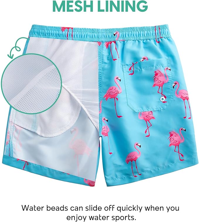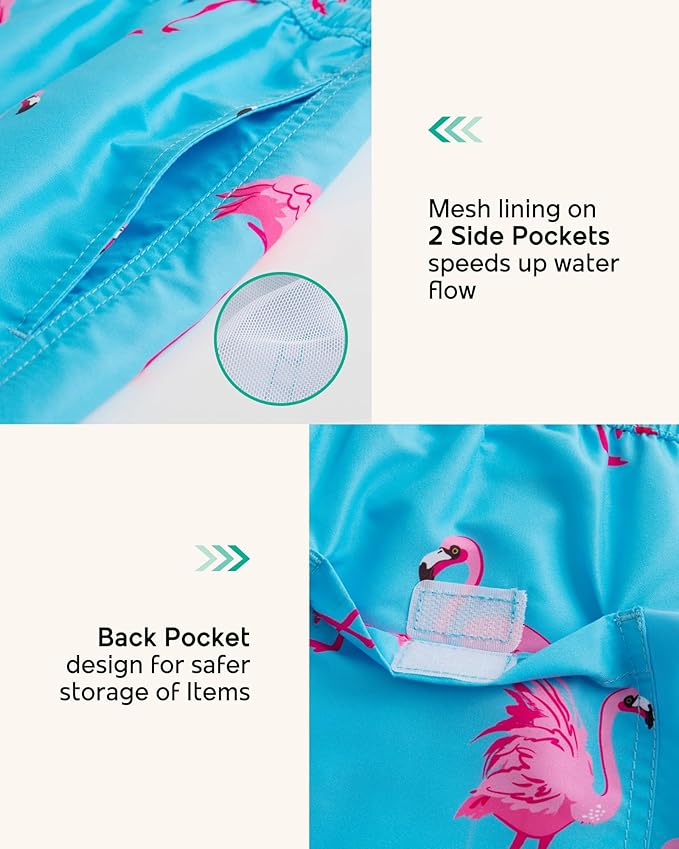 3) Convenient Pockets: The swim trunks have two side mesh pockets and one back pocket with drainage holes to keep the trunks dry.